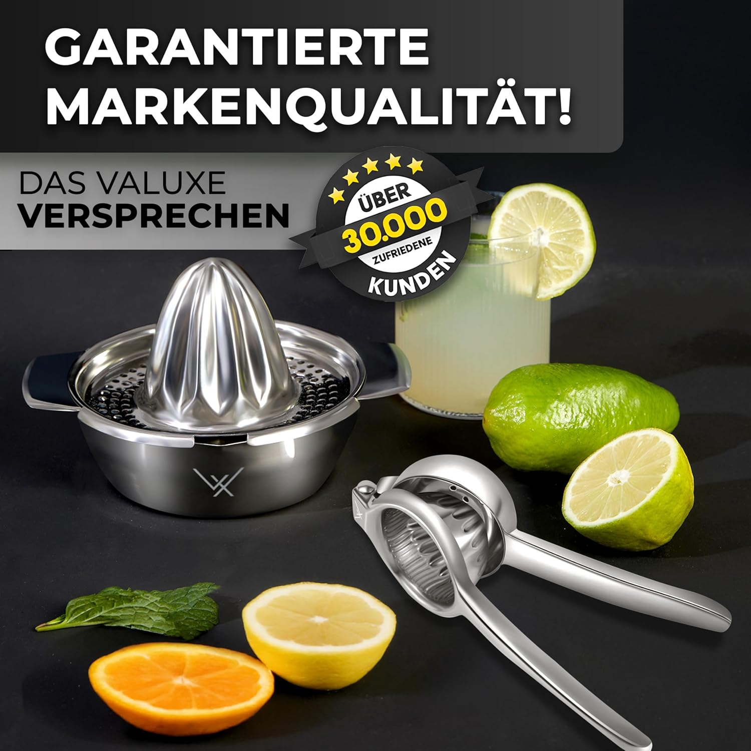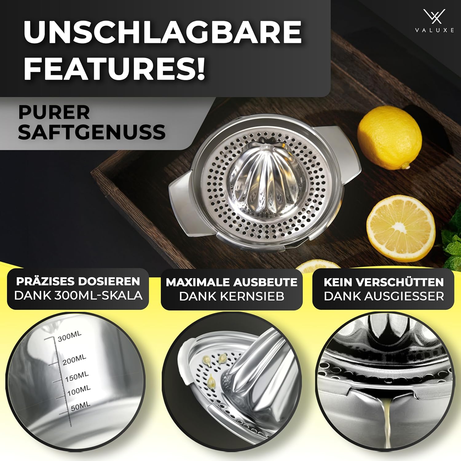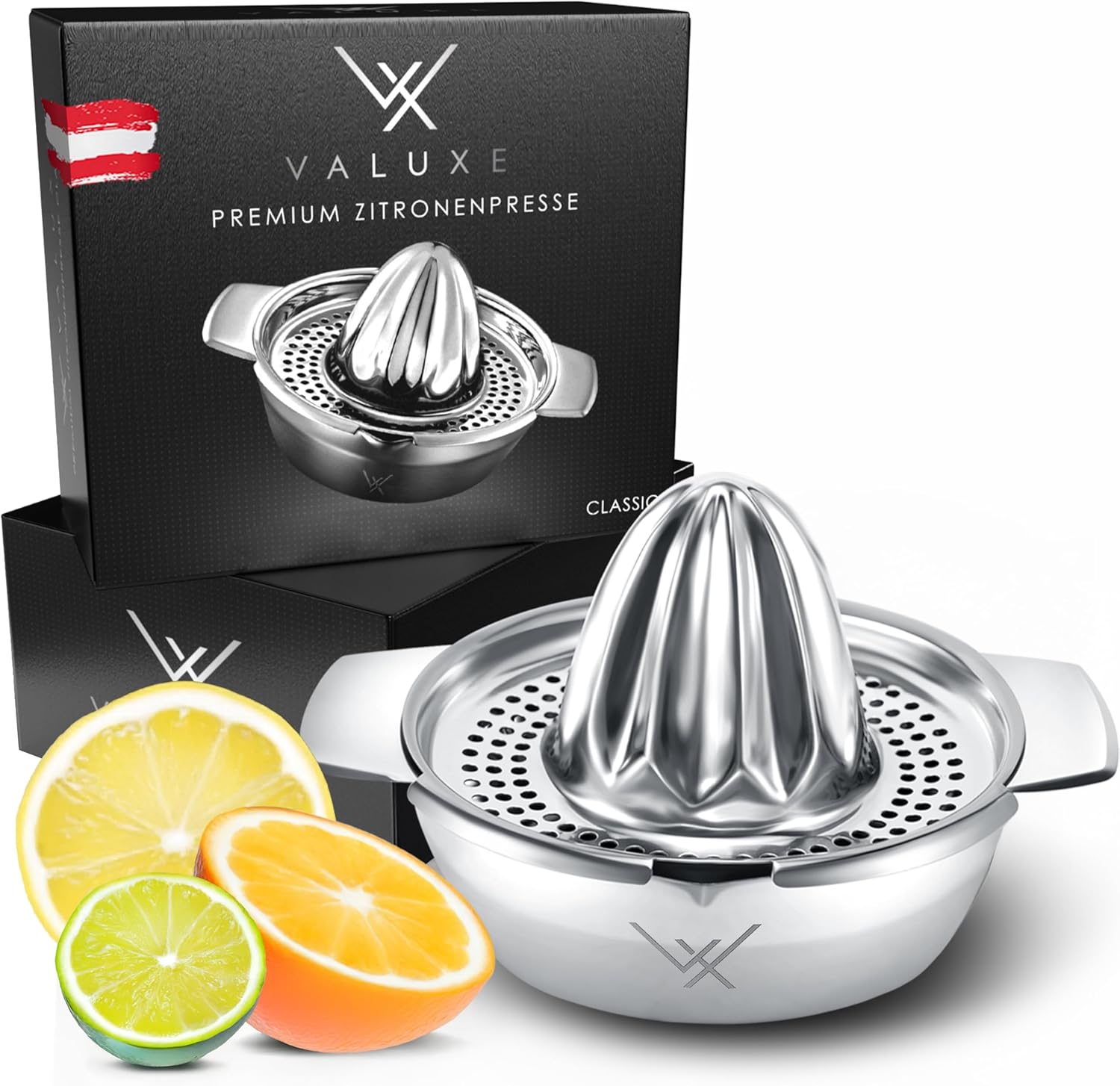 Für alle, die Frische lieben: Die Valuxe Zitruspresse vereint durchdachte Funktion mit zeitloser Eleganz. Der präzise entwickelte Presskegel sorgt für eine besonders hohe Saftausbeute – ganz ohne Kerne. Ob Zitrone, Limette oder Orange: Mit einem Handgriff holst du das Beste aus jeder Frucht.